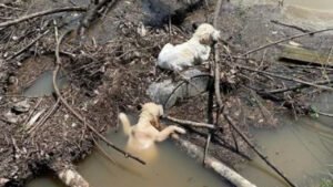 Good samaritan saves two puppies clinging to struggling for survival in stream