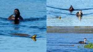 An Australian wildlife photographer captured an unusual scene showing ducks leading a tiger snake to shore. The photographer captured a rare and fascinating moment in nature. Three ducks calmly guided a deadly tiger snake back to shore without confrontation. A photographer encountered a wild moment at Whiteman Park. Tim Kemp,